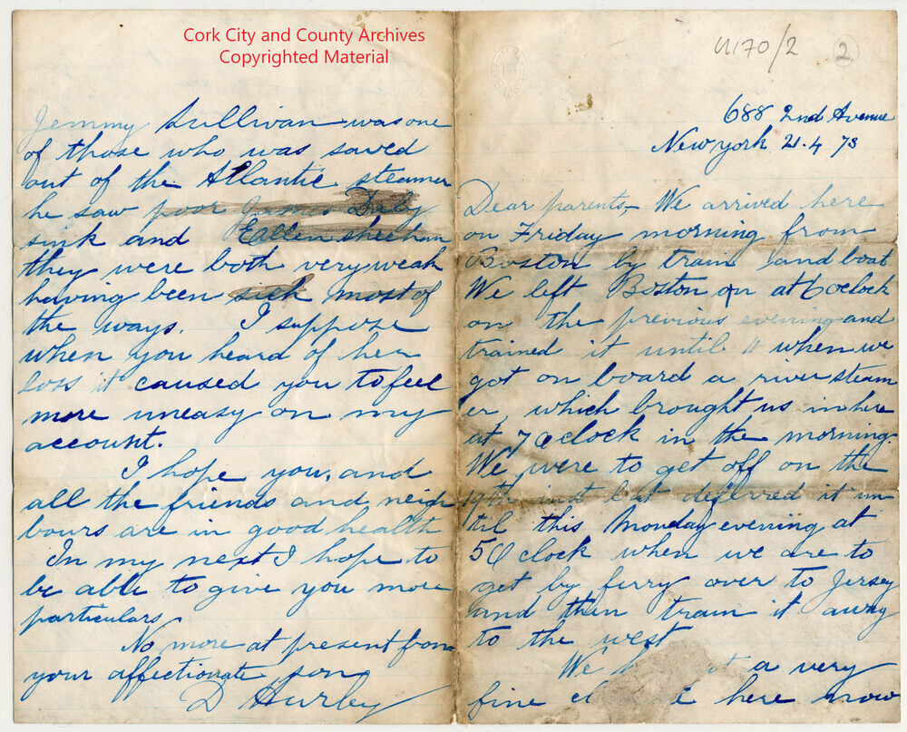 Scope and ContentThe major part of the present collection comprises of 122 letters home to Ireland from Michael and Denis Hurley in the United States over a period of 77 years from 1871 to 1938. The majority (117) of the letters are written by Denis Hurley, although Denis does regularly pass on news of his brother Michael. The earlier letters are mainly addressed to their parents at Tawnies, Clonakilty, and later on to their brothers and sisters, and finally to a few of their nieces in Clonakilty and Timoleague, county Cork. The letters have been arranged chronologically.