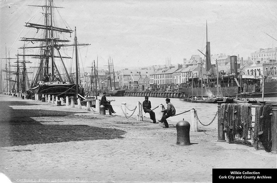 Scope and ContentPhotographic print of Merchant's Quay and Patrick's Quay, Cork. Showing several sailing ships and boats and 1 steam ship at quayside. People in foreground (possibly dock workers) and fishing nets. Goods on quayside ready for transprortation or loading.