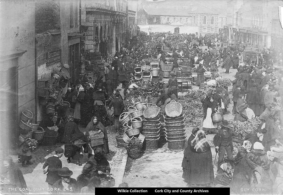 Scope and ContentPhotographic print of Coal Quay/ Cornmarket Street, Cork. Showing street traders and 'shawlies' engaged in buying and selling produce, Cornmarket building, Bridewell
