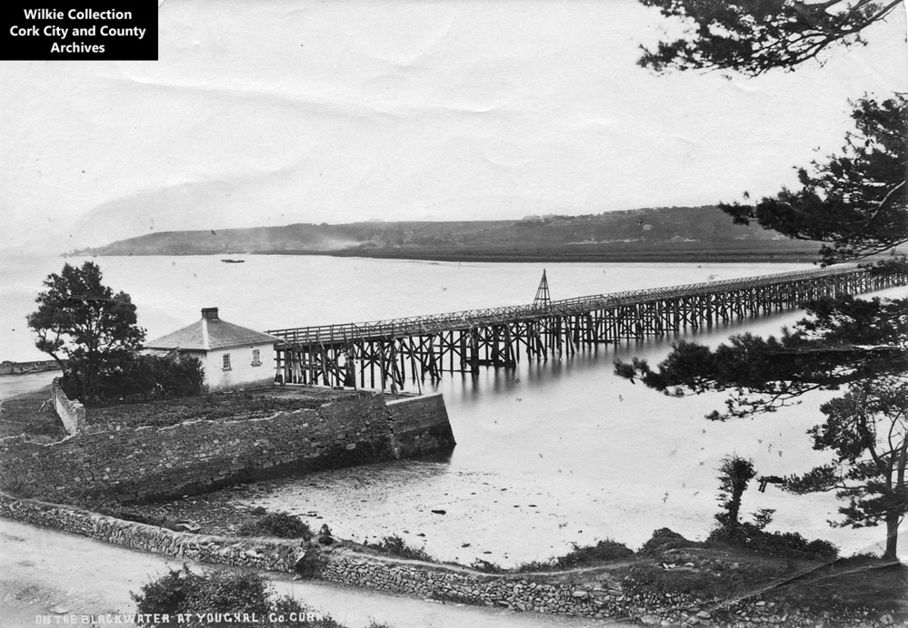 Scope and ContentPhotographic print of bridge over the River Blackwater at Youghal, County Cork. Bridge appears to be of wooden construction.