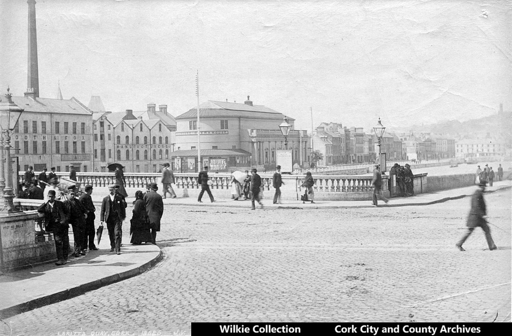 Scope and ContentPhotograph of streetscape taken at junction of St. Patrick's Quay and Bridge Street, Cork, facing southwest, with the north side of St. Patrick's Bridge in the foreground and Lavitt's Quay and Coal Quay in the background. St.Patrick's bridge is busy with people. Visible on Lavitt's Quay is the Booth and Fox feather merchants, mattress and quilt manufactory, with a tall chimney. The Athenaeum/Cork Opera House is in the centre of the photo. Also visible are large telegraph poles, gas lamps, cobbled pavements.