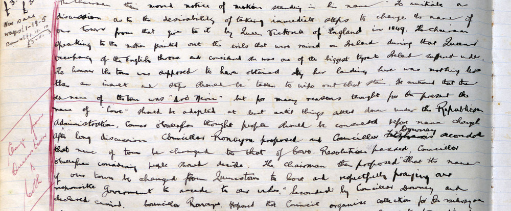 The collection contains a complete set of council minute books from 1853 to 2014 [TC/CQ/M/1-33]. Combined with the other council records the minute books are an important source for researching the origins and development of nineteenth century town government in County Cork. The minutes record celebrations of the opening of the naval facilities at Haulbowline and the 'incog[nito]' visit of Prince Napoleon Bonaparte in 1857 [TC/CQ/M/1], continuing to the foundation of the Irish Free State and the eventual withdrawal of the British navy from the lower Cork harbour area in 1938 [TC/CQ/M/7], and end with the abolition of the town council form of government in 2014 [TC/CQ/M/33]. The minute books are a unique and important source of local history for Cobh, with important events, businesses, and economic activity given mention alongside the official activities of the town council itself.