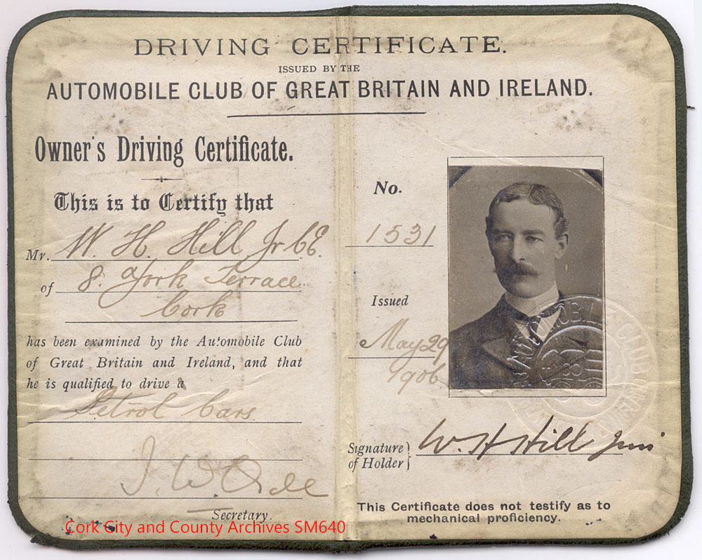 Scope and ContentMS. material mainly relating to William Henry Hill's ownership of motor cars. Licenses to drive motor cars, permits for keeping a motor vehicle (including permit issued by Irish Volunteers, Cork Command, August 1923), correspondence and receipts relating to motor vehicle purchase and repairs, photographs of Hill and family in motor cars, notebook kept by Hill on his motor car travels and repairs, Automobile Club driving certificate 1906, writings by Hill family relating to motor cars, 1925 and 1929-30. Also, licenses to carry arms, 1887 and 1895.