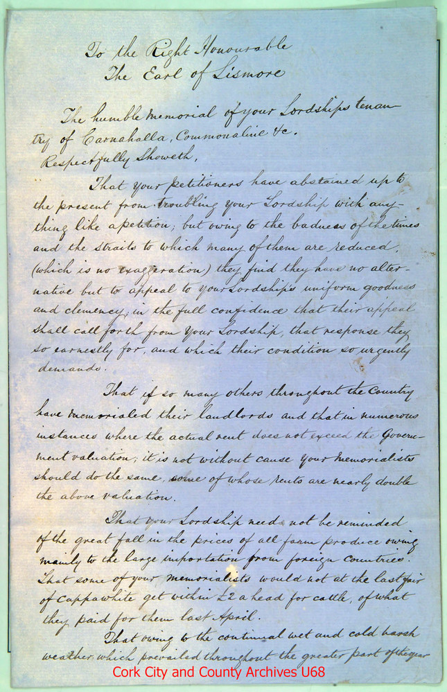 Scope and Content1. ?c.1880 Contemporary copy memorial/petition letter from the tenantry of Carnahalla (Cahernahallia), Commonaline and other areas in the Doon/Cappawhite border area between Co.Tipperary and Co. Limerick, to their landlord, 'The Right Honourable The Earl of Lismore', (George Ponsonby O'Callaghan, Viscount Lismore) requesting a reduction in their rents owing to '...the badness of the times and the straits to which many of them are reduced'. Refers to rents exceeding the Government valuation, the '...great fall in the prices of all farm produce...', the continual wet and cold harsh weather prevailing throughout the year effecting cattle yields and prices, a disappointing potato crop, the failure of crops for the last 3 years, causing a drain of hard-earned savings. It is 'with no small anxiety they look a the coming eight months', but they '...feel from what they have experienced of your Lordship, and your kind and considerate Agent Mr. Taylor...that you are too just and too generous....to think that the poor struggling tenant should bear...the entire of a burden that's crushing the very spirit out of him...'. 40 signatures, plus that of John Slattery, Parish Priest, Kilcommin and Hollyford Co. Tipperary, who adds 'I believe the statements in this are true'. (3pp) Also, photocopy of same. (3pp)