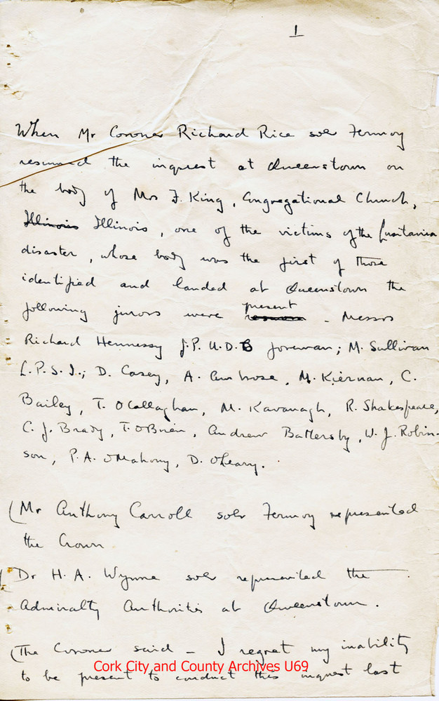 Etendue et contenu'Inquest on Lusitania Victims'. MS. copy of Report of evidence given before the Coroner, Richard Rice, Solr. at Queenstown/Cobh, from 8 to 15 May 1915. Transcript of Inquest Proceedings made by RW Ludgate, reporters room, Examiner Office, Cork.