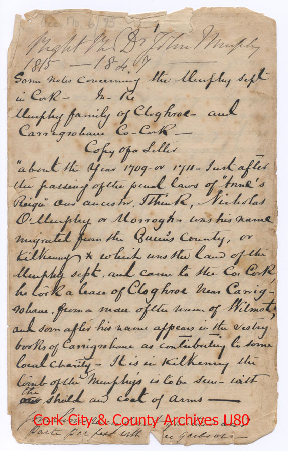 Scope and ContentMS written by Mrs Katherine Donovan, nee Murphy, Tralee, niece of John Murphy (Bishop of Cork, 1815-1847). Includes 'Some Notes concerning the Murphy Sept in Cork....[and]... Murphy Family of Cloghroe and Carrigrohane Co. Cork'. Mainly a memoir relating to Murphy family history and in particular Dr. John Murphy, Bishop of Cork, d.1847, Fr. William Stack Murphy, d.1875 and Archdeacon John Murphy, SS Peter & Paul's, Cork, d.1883. Recounts Nicholas O'Murphy/Morrogh arriving from Queen's County or Kilkenny to Cloghroe etc, mentions Penal Laws, building of SS Peter and Paul Church, etc.
