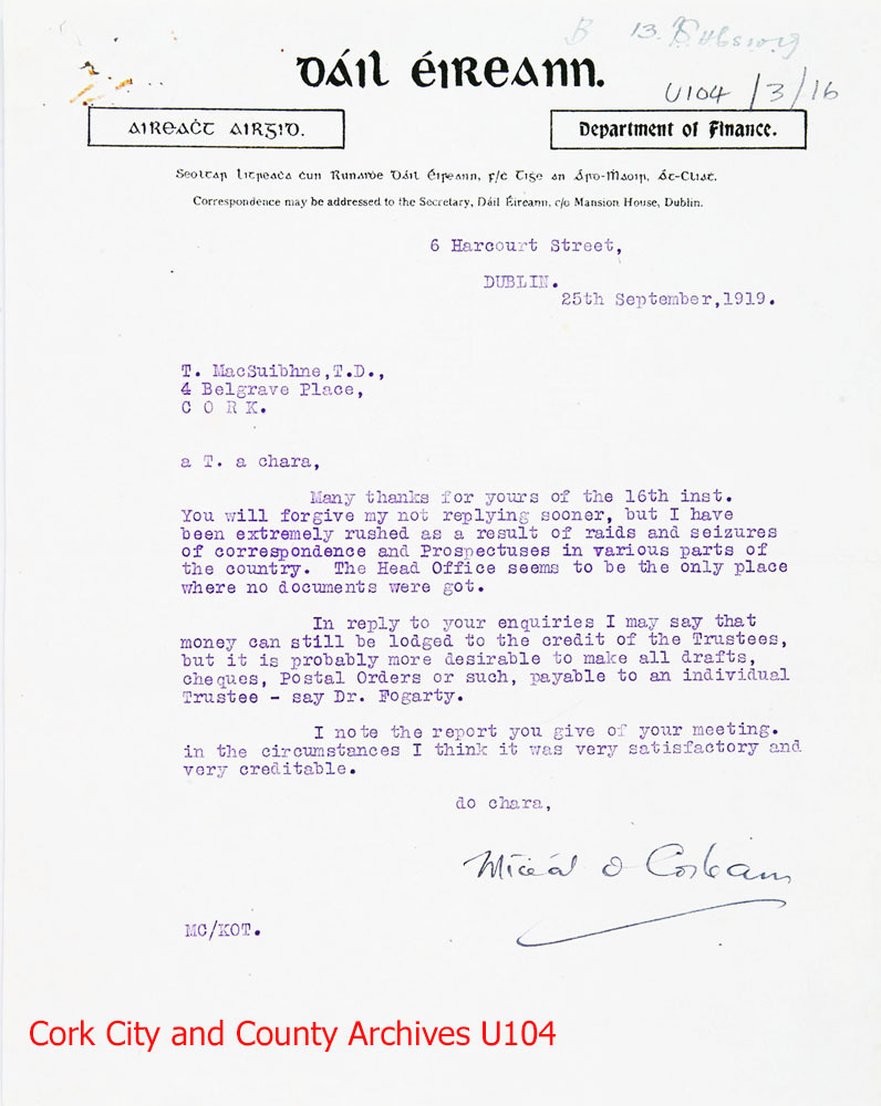 Parts 2 to 6 contain papers seized from some of those present at the meeting, or found at the meeting place, with reports and indices of same; such as U104/2/4, Seized item marked ‘A1', notebook of Terence McSweeney, containing notes on Sinn Fein and republicans in mid-Cork/Macroom area; and such as U104/3/5, seized item marked ‘B2’, letter, in Irish, from Secretary of Sinn Fein Mid Cork constituency office, Macroom, concerning Dáil Éireann Internal Loan 1919; and such as, U104/3/16 seized item marked ‘B13’, letter from Michael Collins, Minister for Finance, Dáil Éireann, Dublin, to Terence MacSwiney T.D. 4 Belgrave Place, Cork, ‘…You will forgive my not replying sooner, but I have been extremely rushed as a result of raids and seizures of correspondence…the Head Office seems to be the only place no documents were got…’.