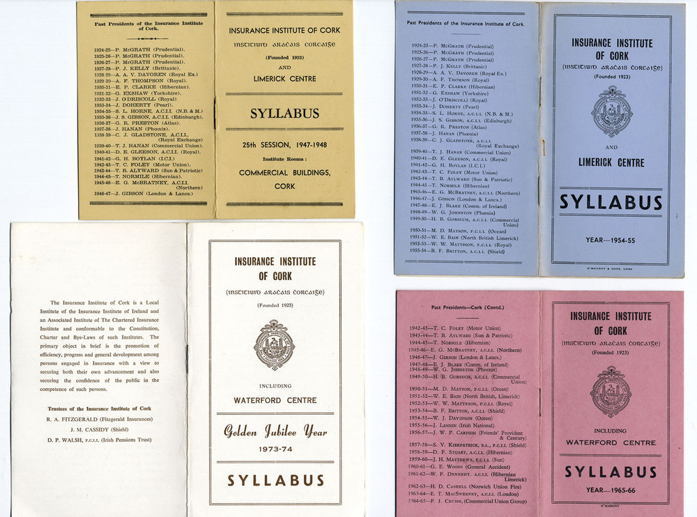 Scope and ContentRecords from the Insurance Institute of Cork, mainly relating to organisation, and social, sporting and community events. Includes photographs from 1920's to 1940's such as charabancs (early buses) on the South Mall, annual dinners, photo of Provincial Bank/Cork Savings Bank, Parnell Place/South Mall (1949). Newsclippings, educational material, pamplets, newsletters, publications and material relating to William Brown, First Hon. Sec. of the Insurance Institute of Cork (1923) and CF Gladstone, distinguished member and education officer.
