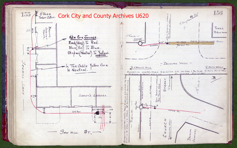 Scope and Content38 volumes of Customer & Cable Management records, Cork City, with drawings showing connections to premises. 1 series of customer correspondence. 1 volume relating to the electricity Acts. Also set of facsimile books. and ESB connection maps of Cork City.