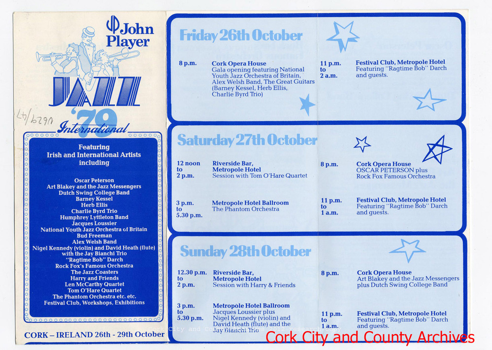 Scope and ContentMaterial, mainly files, relating to Jim Mountjoy's period as Director of Cork Jazz Festival Committee, while he was Managing Director of the Metropole Hotel. Includes (for example): correspondence with agents, public and tourist bodies, Minutes of Committee Meetings, artist publicity material; posters, programmes, photographs.