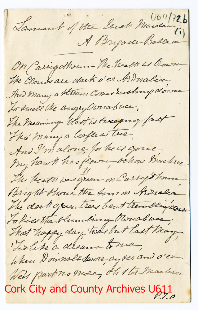Scope and Content'Lament of the Irish Maiden, A Brigade Ballad', lyrics, and music. Lyrics are by Denny Lane. 'On Carrigdhoun the heath is brown, The clouds are dark o'er Ardnalea. . .'