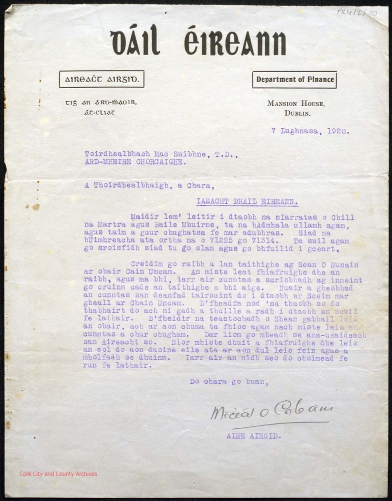 Scope and ContentLetter to MacSwiney from Michael Collins, Minister for Finance noting that the Dáil Éireann Loan receipts for Ballyvourney and Kilmartery County Cork are being forwarded. Also questions whether Seán Ó'Nunain is familiar with the income tax system or whether MacSwiney can recommend someone else. Written in Irish.