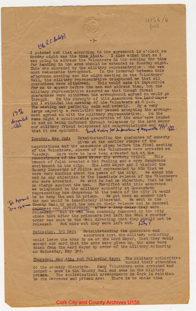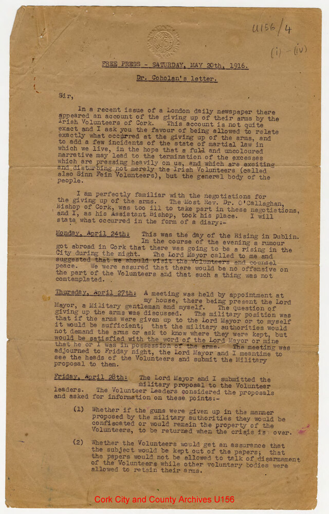 Scope and ContentCopy of letter from Dr. Daniel Coholan, Assistant Bishop of Cork, printed in 'Free Press' Saturday May 20th 1916. Concerns negotiations whereby the Irish Volunteers surrendered their arms in April 1916 and corresting the account which was given 'in recent issue of a London daily newspaper'. Gives a daily account of events, including meeting with the Lord Mayor and a British Military representative, and Volunteer leaders and men. Details the various conditions which has been agreed for the hand over of arms and the events surrounding the hand over, including arrests of members of the Irish Volunteers. Also describes the Church's chaplaincy arrangements for volunteers in the County Gaol and in the Military Prison (near Victoria Barracks). With MS. annotations by Riobard Langford.
