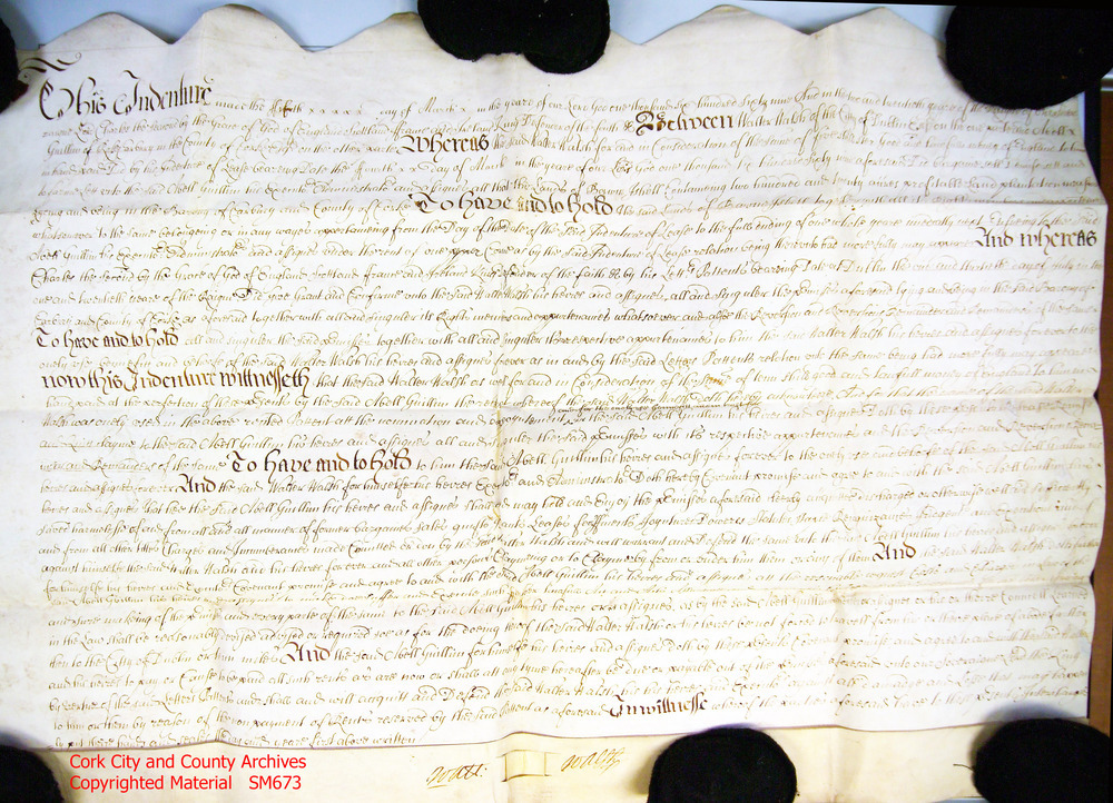 Scope and ContentSM673/1 (6 March 1666) Framed Deed of Settlement, Charter from King Charles II, granting property in Cork City to Cromwellian adventurers/soldiers in Ireland, Henry Eagle of Drogheda and Thomas Leigh of Drogheda, Alderman. Properties include houses, gardens etc. in Cork City formerly in the posession of various people including James Gould, John Campeon, Philip Wynchedeon, and Christopher [Tirry/ Terry]. This property was previously confiscated following the 1641 rebellion in Ireland.
