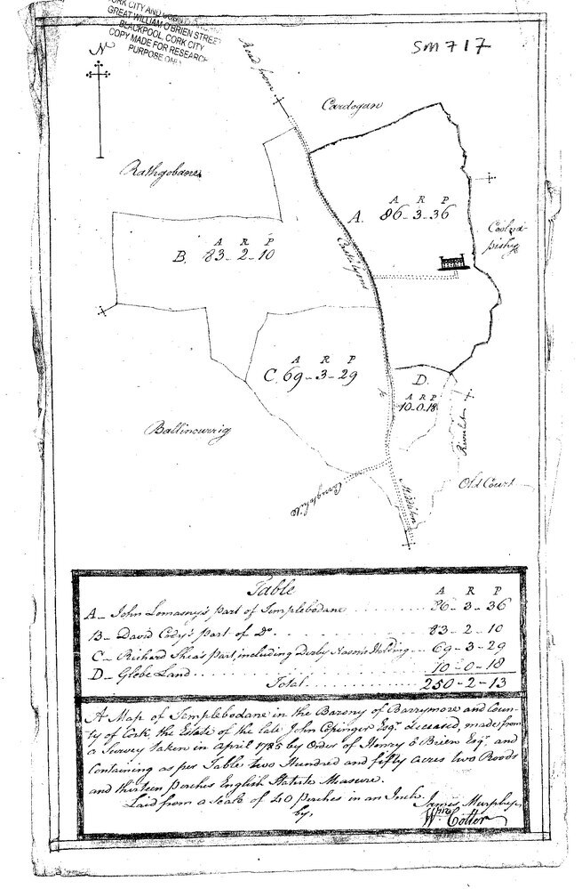 Scope and ContentHand drawn estate map of the townland of Templebodan, Barony of Barrymore, near Midleton, Co. Cork, the estate of the late John Coppinger Esquire. Survey by order of Henry O'Brien Esq. Shows, with reference table, lands of John Lamasny, David Cody, Richard Shea including Derby Nasons holding, and Glebe land. Shows road from Castlelyons to Midleton. Total of 250 acres, 2 roods and 13 perches. Scale is 40 perches to 1 inch. Signed by James Murphy and William Cotter.