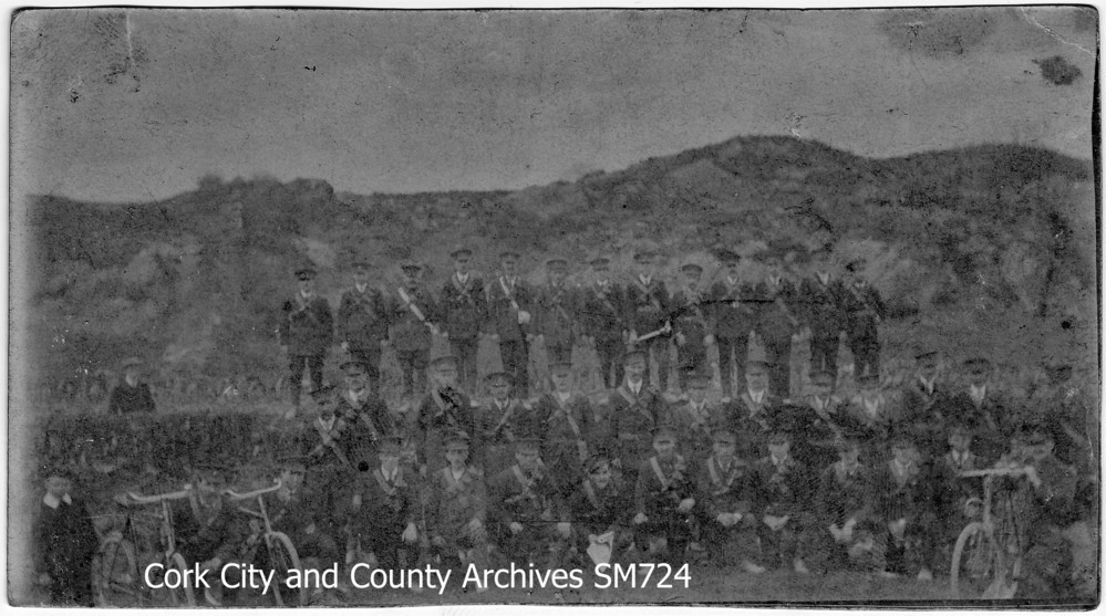 Scóp agus InneacharPostcard photo. of group of ca.40 men evidently on a training exercise, with bandoliers and peaked caps and three bicycles. Hills visible in background, but location and date are not indicated. The image is faded.