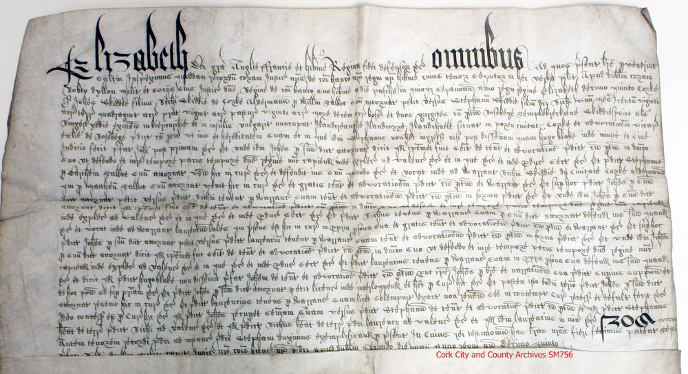 Scope and ContentDeed, in Latin, of Elizabeth I [1565], relating to lands in Cork, including Ringaskiddy ('Skiddiespoint alias RingSkiddie' and 'Glandrought'], the property of the Skiddy family. The document refers to [John] and Stephen Skiddy, the sons of [Alderman Richard] Skiddy. Reference is also made to Robert Dillon of Dublin and William Talbot [attorney]. A partially legible note on the reverse refers to 'all the lands and [hereditaments] of RynnySkiddy', and is followed by the signature of John Skiddy Fitz Richard. Other signatories [witnesses] are [Edmond] Goold, John Cronyn, and Dominic Miagh.