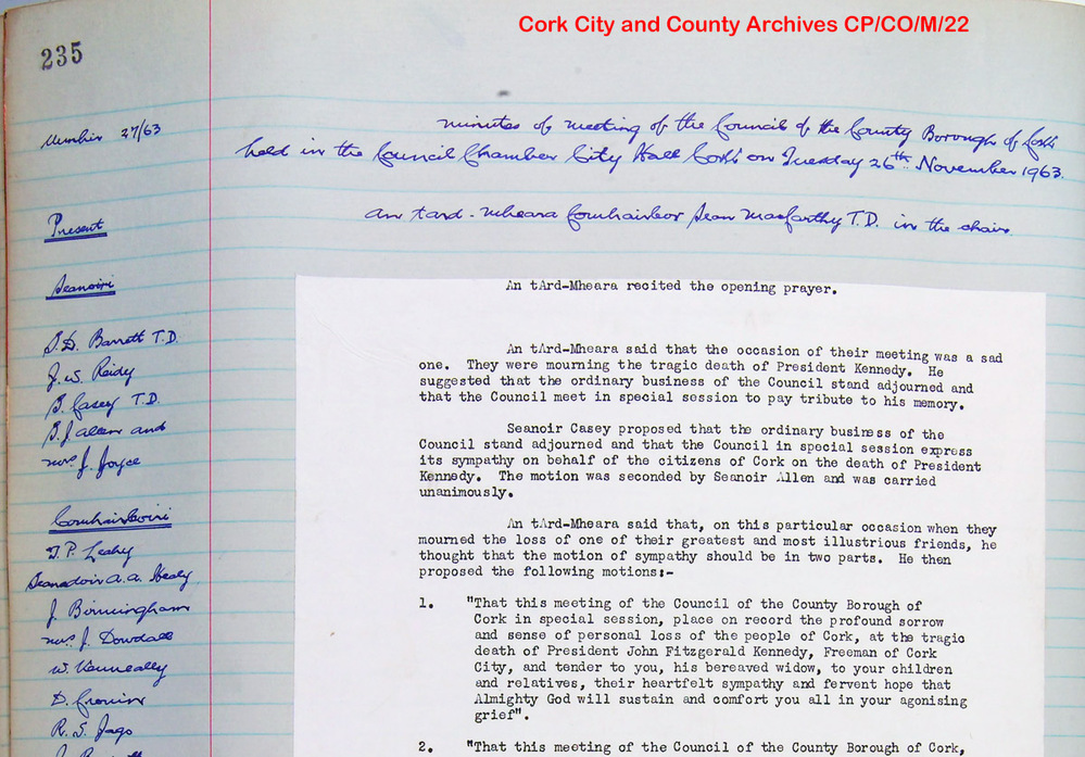 Special meeting to confer Freedom of City on President John F. Kennedy '...in token of our pride that this descendant of Irish emigrants should have been elected to such an exalted office...'. (p143) (28 Jun 1963)