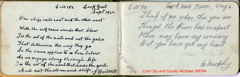 Scope and ContentCopy of prison autograph book compiled by Joe O'Mahony, Midleton, while in Cork County Gaol in 1922 during the Civil War.