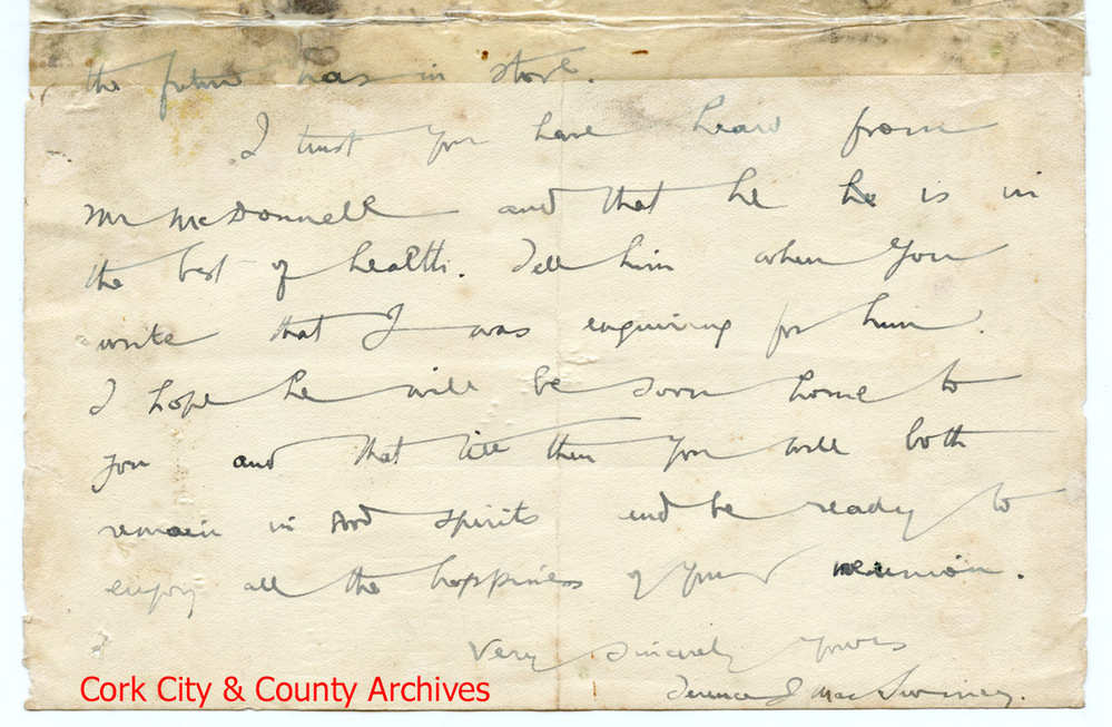 Scope and Content1. 23 May 1916 MS. copy of letter from Terence MacSwiney, Block A Room, Richmond Barracks, Dublin, to 'Dear Mrs. McDonnell', (Kathleen McDonnell, Castlelack, Bandon, wife of William K. McDonnell, Irish Volunteers). Thanks her for a 'very welcome present'. The prisoners are 'deeply grateful' to all their friends, who are supplying 'a variety of comforts'. His health is good, and the kindness of friends helps to lighten their confinement '...but in the evening, we look to the sunset, we realize that nothing is to be compared with freedom. However in God's good time this too will be restored. Let us hope the discipline of the present enforced restraint will serve to make us all better fitted, for whatever duty, the future has in store...'. He trusts that she has heard from Mr. McDonnell (William McDonnell, her husband), that he is in the best of health, and that they remain in good spirits, ready to enjoy the happiness of re-union. (3pp)