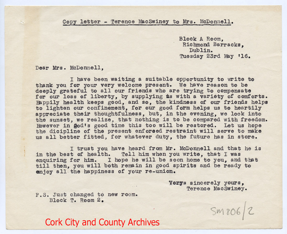 Ámbito de contenido1. 23 May 1916 MS. copy of letter from Terence MacSwiney, Block A Room, Richmond Barracks, Dublin, to 'Dear Mrs. McDonnell', (Kathleen McDonnell, Castlelack, Bandon, wife of William K. McDonnell, Irish Volunteers). Thanks her for a 'very welcome present'. The prisoners are 'deeply grateful' to all their friends, who are supplying 'a variety of comforts'. His health is good, and the kindness of friends helps to lighten their confinement '...but in the evening, we look to the sunset, we realize that nothing is to be compared with freedom. However in God's good time this too will be restored. Let us hope the discipline of the present enforced restraint will serve to make us all better fitted, for whatever duty, the future has in store...'. He trusts that she has heard from Mr. McDonnell (William McDonnell, her husband), that he is in the best of health, and that they remain in good spirits, ready to enjoy the happiness of re-union. (3pp)