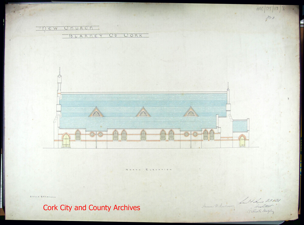 Scope and ContentArchitectural design drawings including elevations, plans and sections of Roman Catholic churches in Cork, including Taur Newmarket (1913-14), South Infirmary (?c1899), Cullen (1905), Glounthaune (1896), Mogeely (1909), Norwood Convent Cobh (1897), Durrus, Kiskeam, Blarney (c1918), and also for churches in Bruree Co. Limerick (1922) and Ballyporeen Co. Tipperary. Also single drawings of minor design features for windows and other features of St. Vincent's Cork (?1884-5), a sanctuary mosaic for St.Michael's Blackrock (1914) and confessional frieze details for St. Patrick's Cork (1915). Also 1 drawing of unknown church, possibly Ballyporeen (SH/6).