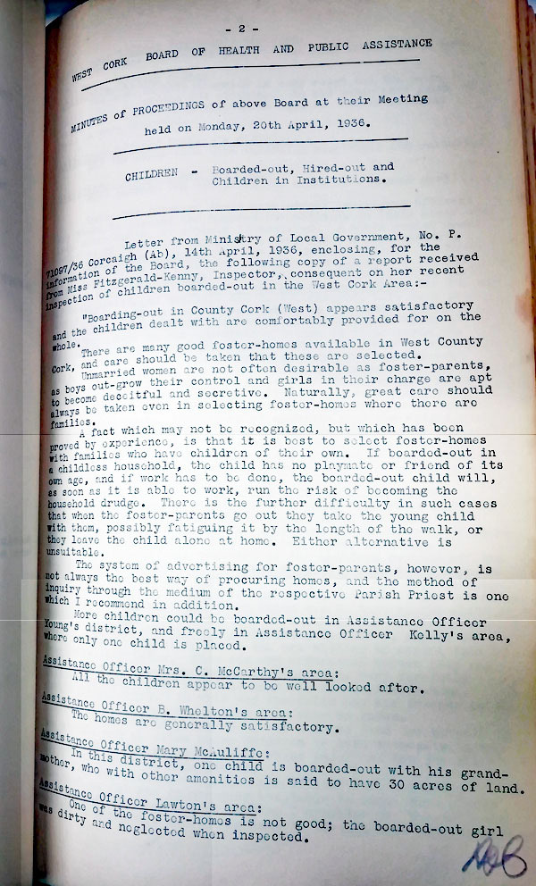 The records of the Board of Public Assistance document the activities of the Board. The records appear to have been maintained by the secretary of the Board and mainly comprise of documents relating to fortnightly Board meetings and correspondence files. The records relate to the administration, staffing and financial affairs of the County Home and Hospital in Cork City as well as district hospitals in Bandon, Cobh, Kinsale, Macroom, Midleton and Youghal. They also record the activities of the Superintendent Assistance Officers for the City and County, Home Assistance Officers and Medical Officers. The collection includes sensitive personal information including information on patients of the Board, admission of patients to Bessboro Mother and Baby Home and the names of Boarded out Children. The collection is comprised of three series of volumes and 118 boxes of files which have been divided into 5 series. There is some inconsistency in relation to what has survived and there are numerous gaps in the collection. The majority of the files date from 1930 to 1955.