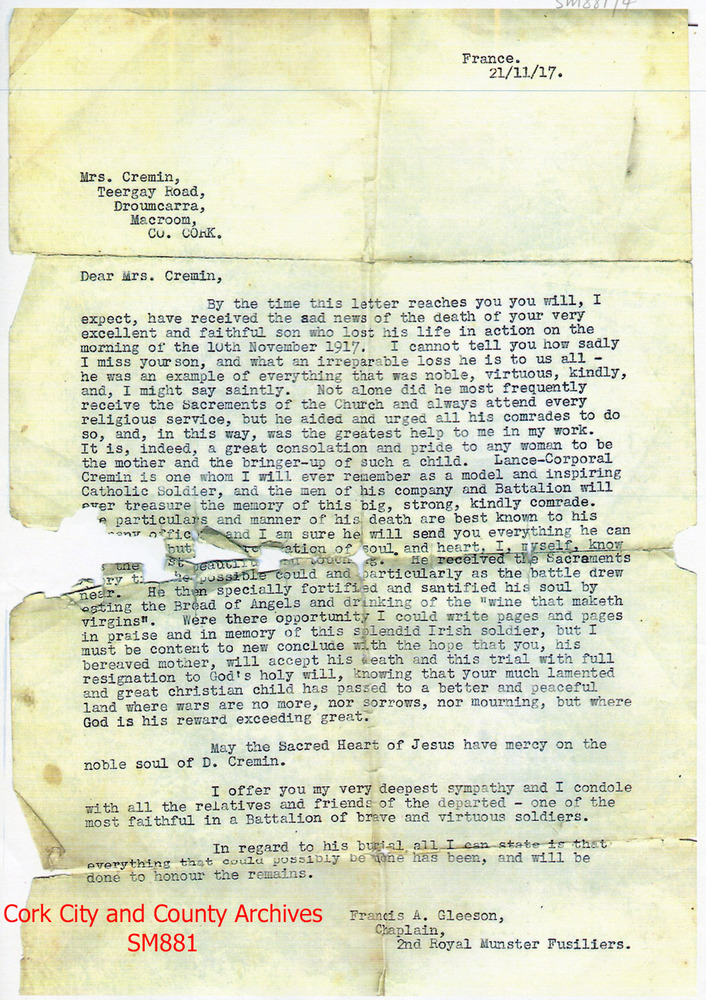 Scope and ContentSM881/1. TS. letter, 11 Nov 1917, from Fr. Francis A. Gleeson, Chaplain, 2nd Battalion, Royal Munster Fusiliers, France, to Mrs Cremin, Teergay Rd., Droumcarra, Macroom, County Cork, concerning the death of her son, Lance Corporal Daniel Cremin, in action on 10 Nov 1917. Daniel is referred to as 'noble, virtuous, kindly...saintly....'. He frequently received 'the Sacrements of the Church...and urged all his comrades to do so...'. He was 'a model and inspiring Catholic soldier, and the men of his company and Battalion will ever treasure the memory of this big, strong, kindly comrade. The particulars and manner of his death are best known to his company officer, and I am sure he will send you everything he can [Command], but his preparation of soul and heart, I myself, know, was the [most] beautiful and touching. He received the Sacraments every [time] he possible[sic] could and particularly as the battle drew near...'. He hopes that she, his '...bereaved mother will accept his death...with full resignation to God's holy will...'. He was '...one of the most faithful in a Battalion of brave and virtuous soldiers'. Reassures Mrs Cremin that everything possible has been done to honour his remains.(1p)