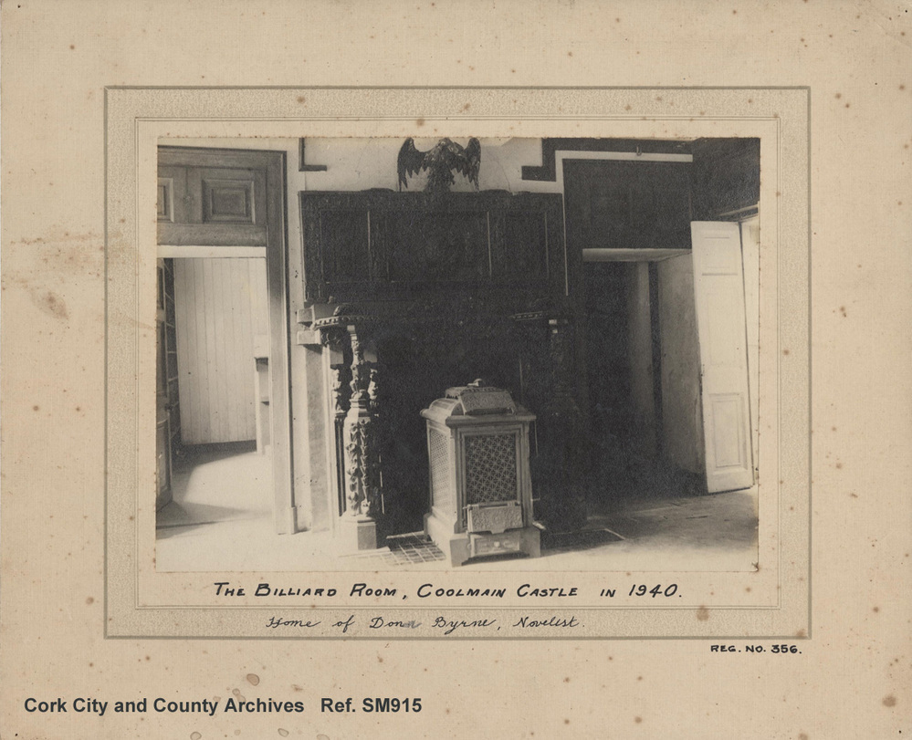 The image is captioned: 'The Billiard Room, Coolmain Castle in 1940: Home of Donn Byrne, Novelist'. The reverse of the photograph carries an inscription: 'Reg.356. Carved wooden surrounds to stone in Coolmain Castle'. The castle is known as the last place of residence of Irish neo-romantic novelist Donn Byrne who died in 1928 and is buried close to the castle.