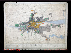 Scope and ContentGraphical map series of Cork city, with hand-coloured annotations representing key statistical information in respect of town planning in Cork. Maps include annotations depicting rail and tram transport routes, movement of cattle to market, ground gradient contours, population densities, and locations of public buildings such as fire stations, churches, and schools. The maps also depict industrial and commercial zones in the city such as food markets and bond warehouses. The original map numbers are recorded in the title of each map description in square brackets.