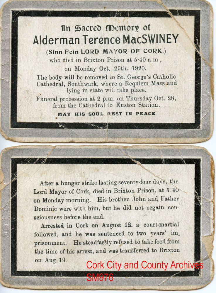 2. Memorial card, printed in London as above, mentions death of MacSwiney on hunger strike.