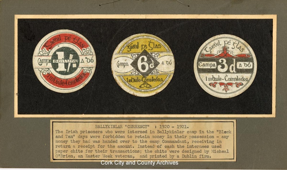 Scope and ContentIRA/republican prisoners, such as Tadhg Barry, were interned at Ballykinlar Co. Down during the War of Independence. Such prisoners were forbidden to retain money in their posession. Internees used paper chits for their transactions, which were designed by Michael O'Brien, a veteran of Easter Week, and printed in Dublin.
