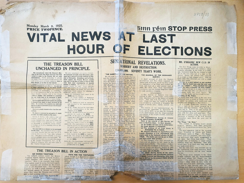Scope and Content'The Treason Bill Unchanged in Principle', 'The Treason Bill in Action', (reference to Treasonable Offences Act 1925), 'Sensational Revelations, Robbery and Destruction £50,000,000 Seventy Years Work (re. Ordnance Survey) ', 'Mr. O'Higgins New CID In Action'. etc.
