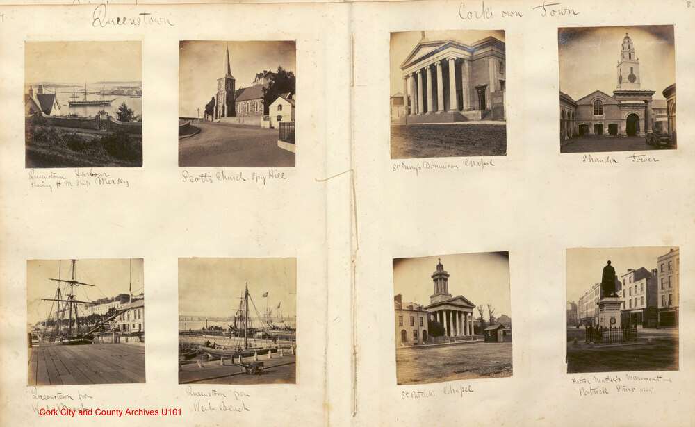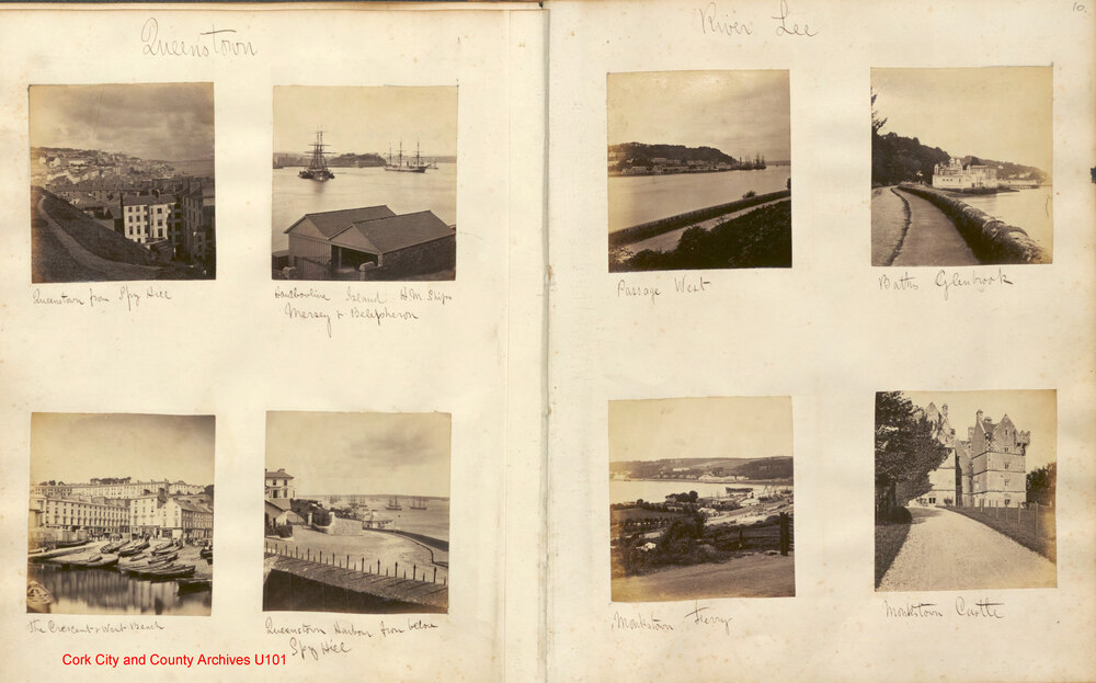 harbour showing HM ship Mersey, Scott's Church Spy Hill Cobh, St.Ann's Shandon, St. Patrick's Church Lower Glanmire Road, Father Mathew statue Patrick Street, harbour and HM ship Belepheron, West Beach Cobh, Harbour from Spy Hill, Passage West, Glenbrook Baths, Monkstown ferry, Monkstown Castle, Blarney Castle, Kilcrea Abbey. (Online digital copy of photos is available)