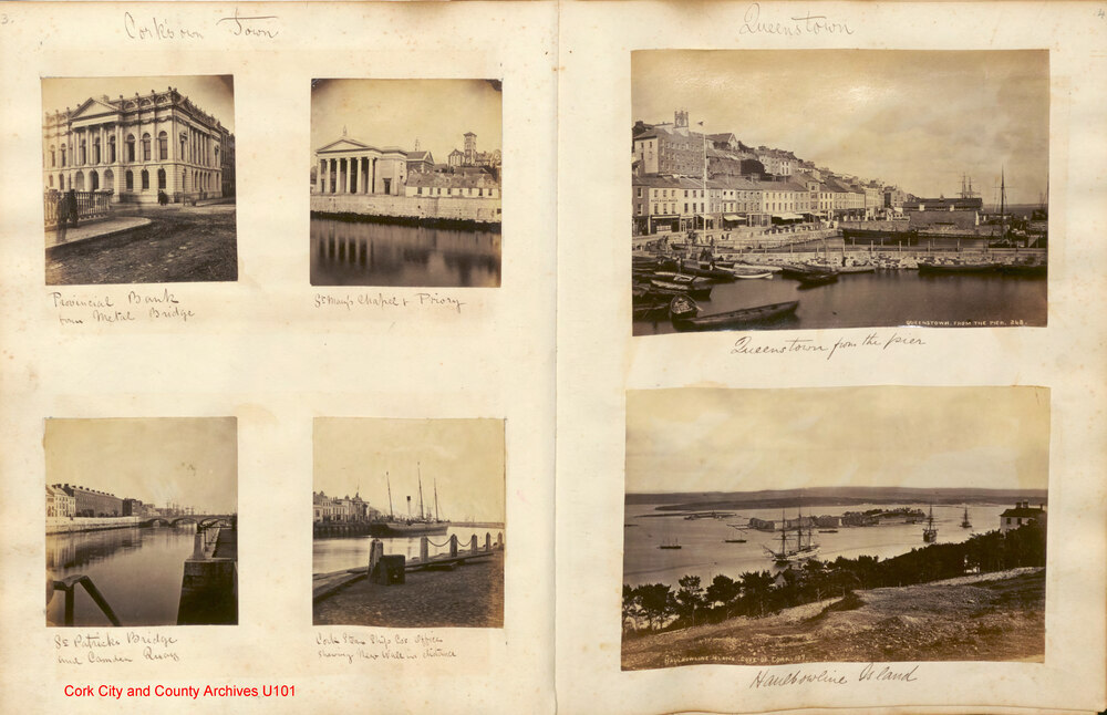 Including ships at Merchant's Quay, Grand Parade, Corn Exchange (old City Hall), Provincial Bank Warrens/later Parnell Place, St.Marys Church and priory Pope's Quay, St.Patrick's Bridge and Camden Quay, Cork Steam Ship Company offices and 'new wall', various of Queenstown/Cobh, Haulbowline Island and harbour (sailing ships at anchor),