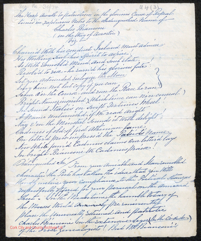 Requests that, for the 'patriotic stanzas' within, '....the Muses would pre-eminently place the universally esteemed and patriotic Charles Bianconi in the extensive leger (on the cr. side) of the Irish Genealogist...'.