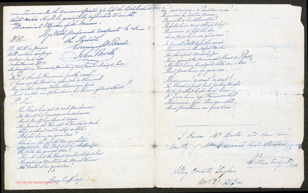 Ends with a further poem in 5 verses- 'The Bard has got so rich perchance / He must his consequence advance / And puff his proud cigar / He scorns the thought to "trudge" a mile / Clip a short cut or step a stile / Behold him on your car!!'. (V.1) ... 'To travel still by either road / Bianconi's the safest Mode- / The cheapest mode by far / Then grant the Connaught Bard a Pass...'. (V4)