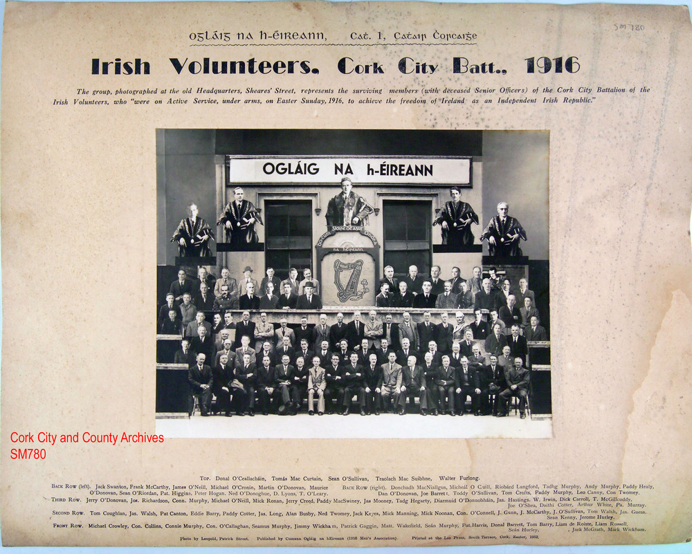 Scope and ContentLarge composite photograph, members of the Cork City Battalion, Irish Volunteers, who 'were in active service, under arms, on Easter Sunday 1916'.