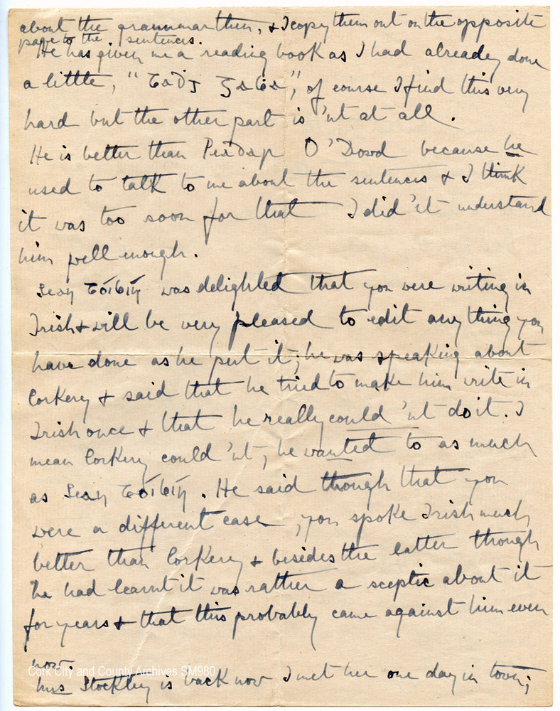 Sean Tóibín was delighted that you were writing in Irish & will be very pleased to edit anything you have done as he put it; he was speaking about Corkery [Daniel Corkery] & said that he tried to make him write in Irish once & that he really could'nt do it. I mean Corkery could'nt, he wanted to as much as Sean Tóibín. He said though that you were a different case, you spoke Irish much better than Corkery & besides the latter though he had learnt it was rather a sceptic about it for years & that this probably came against him even now.