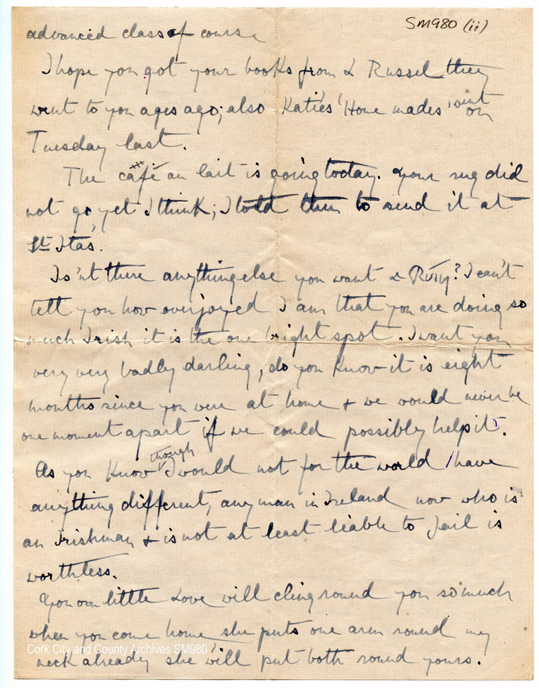Is'nt there anything else you want a Rúin? I can't tell you overjoyed I am that you are doing so much Irish it is the one bright spot. I want you very very badly darling, do you know it is eight months since you were at home & we would never be one moment apart if we could possibly help it.