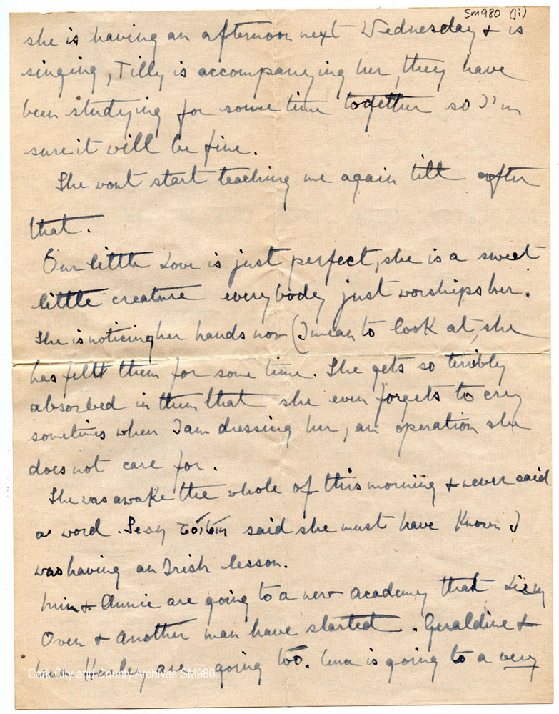Our little love [daughter, Máire b. 23 June 1918] is just perfect, she is a sweet little creature everybody just worships her. She is noticing her hands now ( I mean to look at, she has felt them for some time. She gets so terribly absorbed in them that she even forgets to cry sometimes when I am dressing her, an operation she does not care for.