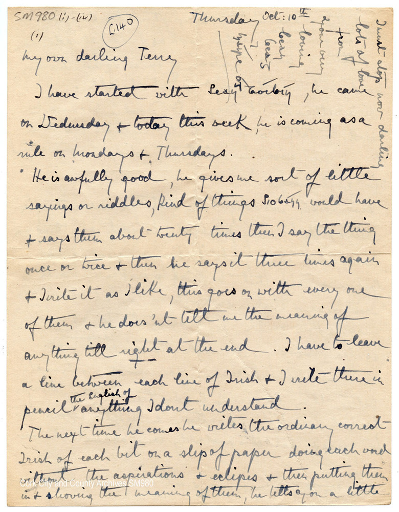 He is awfully good, he gives me sort of little sayings or riddles, kind of things Siobhán would have & says them about twenty times then I say the thing once or twice & then he says it three times again & I write it as I like, this goes on with every one of them & he does'nt tell me the meaning of anything till right at the end. I have to leave a line between each line of Irish & I write there in pencil the English of anything I dont understand.